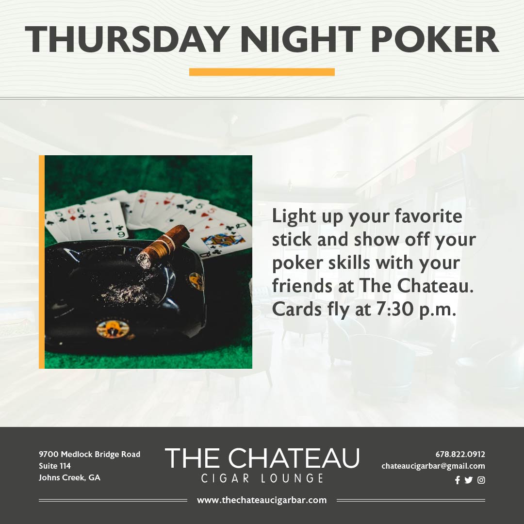 Light up your favorite stick and show off your poker skills with your friends at The Chateau. Cards fly at 7:30 p.m.