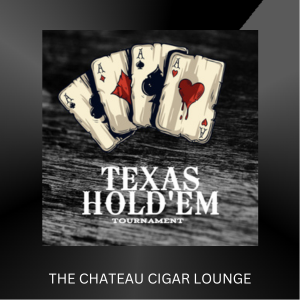 Ready to up the ante on Thursday nights? Join us for Texas Hold’em Poker at The Chateau Cigar Lounge! Grab a seat, test your skills, and compete for cigar prizes. With top-notch tables, drink specials, and a lively atmosphere, it’s a night you won’t want to miss! See you at the tables!